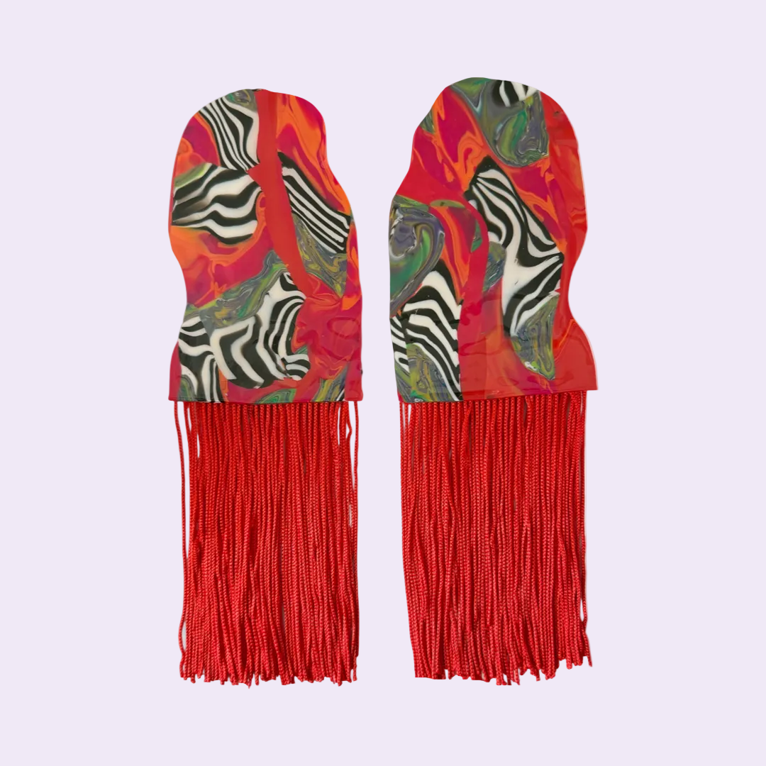 Sunset retro mix, rouched design polymer clay earring with orange fringes.