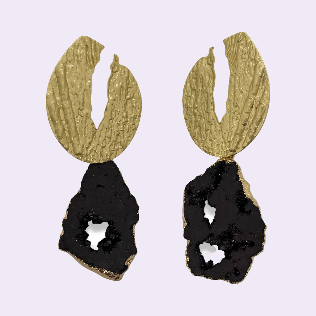 Textured brass hollow pendant with a black druzy stone.